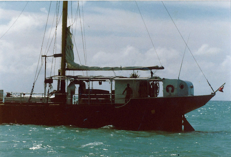 Cette impression d'être un imposteur, je l'avais déjà ressentie quelques mois auparavant, aussitôt après la toute première mise à l'eau de Chercha-Païs, quand nos voisins de port à La Rochelle, Gérard Janichon et Jérôme Poncet, l'équipage de Damien, fameux à jamais, nous avaient traités en authentiques vagabonds des mers. Aucun de nous, alors, n'avait encore pris la barre d'un quelconque voilier, fut-ce un dériveur léger… Une traversée de l'Atlantique plus tard, à la pointe Fouillole, dans l'avant-port de Pointe-à-Pitre, je ne fais pas davantage le fier, en compagnie de Mireille, en donnant de discrets coups d'aviron pour voir de plus près un autre bateau de légende. Au milieu du spectacle désolant de cet endroit fait de bidonvilles, d'épaves de toutes sortes, d'ateliers et d'entrepôts abandonnés, se tient en effet Lucifer, le trois-mâts de plus de quarante mètres de long d'Henry Wakelam, le vieux complice de Bernard Moitessier lors de ses aventures dans les mers du Sud.