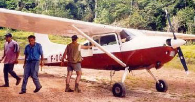 Une fois posé pour de bon, François Suski, l'homme en question, s'extrait de son Cessna et m'explique qu'il était en train de discuter à la radio -tout en se posant sur une bande de latérite entourée d'obstacles !- quand il s'est rendu compte que les arbres gênaient la transmission. Voilà pourquoi il est remonté pour s'offrir deux minutes de conversation supplémentaire.