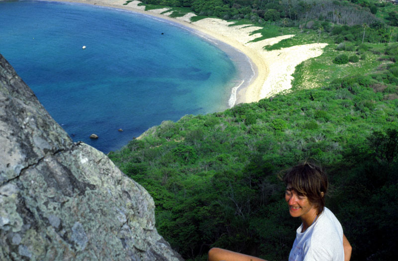 Nous montons par une petite varappe assez aérienne dans une falaise au pied de laquelle la mer brise avec force. Les sternes jouent dans le vent autour de nous, sous le haut du piton que nous atteignons latéralement, en ouvrant un passage à travers une végétation équatoriale, avant de redescendre par des éboulis, dans lesquels s'enfuient des iguanes de belle taille. Pleins d'énergie après un repas sur le pouce, nous retournons en "ville" par le raccourci qui fait traverser la piste de l'aérodrome (des échelles sont prévues pour franchir les barbelés).
