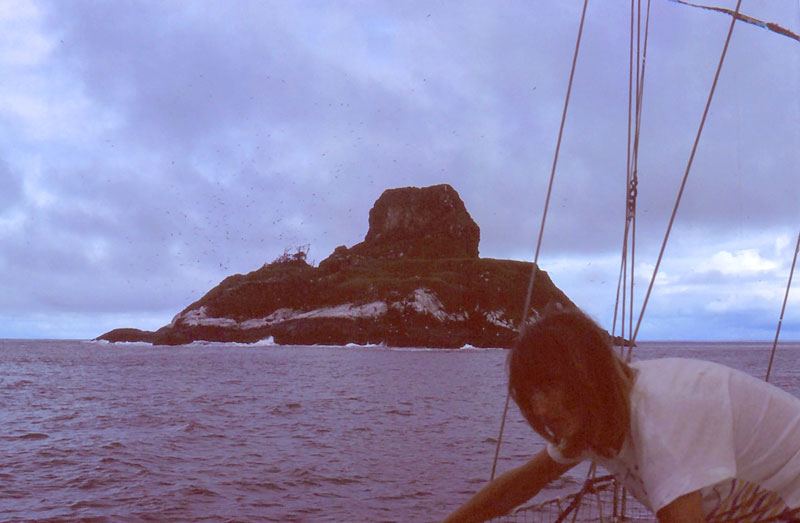 Peu après minuit, de façon à être de jour au Grand Connétable, nous appareillons au moteur, dans un calme absolu. Nuit paisible pendant laquelle le vent s'est à peine installé, ce qui nous fait arriver dans l'après-midi auprès de ce rocher perdu où nous mouillons à la voile. Ce Connétable a fière allure, coiffé d'un piton autour duquel tournoient des centaines de frégates, il comporte un plateau envahi de végétation où nichent tous les autres oiseaux, surmontant un socle de pentes rocheuses qui plongent dans la mer. Alain et moi, nous y prenons pied au prix d'un débarquement périlleux. C'est d'abord l'odeur qui frappe, ammoniaquée, forte, horrible. Puis les œufs qui jonchent le sol, verdâtres, tachés de brun, posés partout, les cris des volatiles et leurs envols en tous sens en une belle sarabande… La montée est difficile à cause de la pente, de la végétation et de l'omniprésence des sternes que notre intrusion excite. Nous craignons qu'elles nous attaquent, mais leurs acrobaties et leurs piqués menaçants restent des manœuvres d'intimidation. Sur le plateau, encombré de hautes herbes coupantes, restent des traces de l'époque lointaine où le phosphate de l'île était exploité ; au-delà, au pied du piton terminal, c'est le royaume des frégates dont la taille et le nombre nous incitent à la prudence. Dans cette frénésie aviaire, avec Chercha-Païs qui danse dans la houle, tout en bas, et les brisants qui frappent au loin les rochers peu avenants du Petit Connétable, l'ambiance est très particulière.