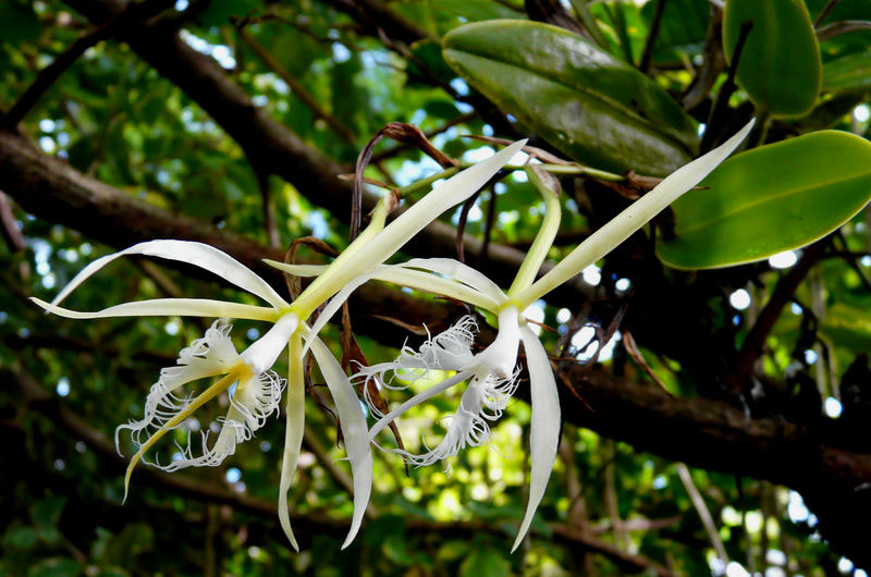 Nous repartons en zigzagant entre les roches pour aborder finalement une miniature d'île ceinturée de cascades. Repas, baignade, et Pierre nous entraîne à sa suite dans les branchages pour nous faire partager sa passion des orchidées. Ces fleurs, qui n'éclosent parfois qu'une journée, sont souvent destinées à un insecte spécifique et utilisent des artifices de science-fiction. Ainsi, Pierre nous montre l'une d'elles, dont le bourdon attitré déclenche une gâchette en pénétrant dans la fleur pour butiner son nectar, ce qui fait partir vers son dos deux fléchettes à ventouses porteuses de pollen ! Le bourdon repartira de la sorte féconder une orchidée semblable, en un échange vital pour ces fleurs hermaphrodites. Rien que dans ce petit coin, il y a des orchidées immenses, interminables, telle la vanille, d'autres à peine discernables, tantôt sur des arbres, tantôt sur des roches, déployant une infinie diversité de formes et de couleurs. C'est un monde végétal fascinant, un sujet inépuisable et passionnant dont je comprends maintenant qu'il donne la fièvre à certains, à la manière de l'or.