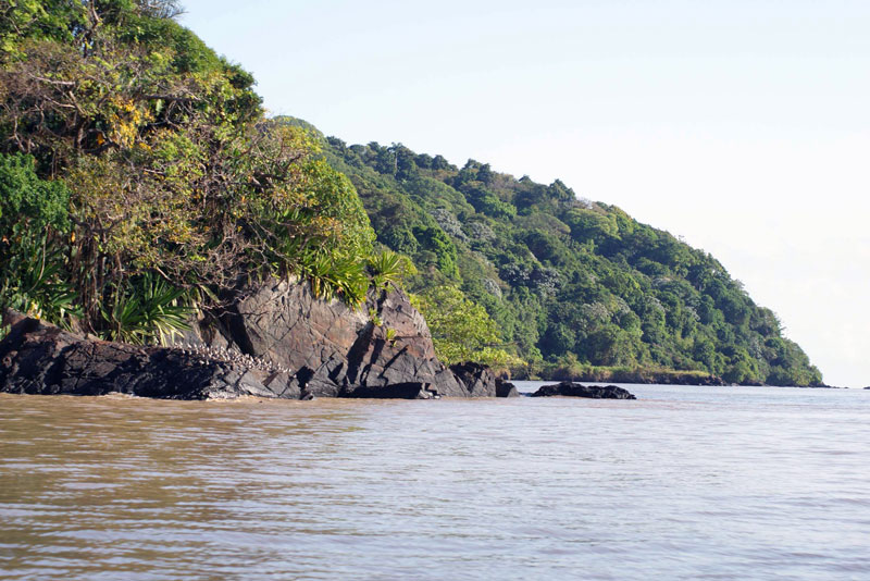 A terre, dans ce promontoire à l'écart de tout, anciennement occupé par un camp forestier du bagne, nous trouvons des arbres fruitiers, de nombreux vestiges de murs et de constructions, ainsi qu'un antique fortin et deux restes de jetées, vieilles pierres complètement submergées par la végétation. Dans une moiteur oppressante, la progression est difficile et nous revenons à l'annexeannexe : petite embarcation pour assurer la liaison entre un voilier et la terre. par les rochers du rivage ; là, nous sommes bloqués par un petit caïman à l'allure féroce, qui se gonfle, crache et joue des mâchoires : la bête a beau faire moins d'un mètre, elle ne donne pas envie d'approcher !