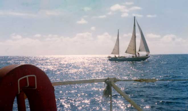 Comment se sentir plus seul, je veux dire plus serein et plus tranquille, qu’en plein milieu de l’océan ! Voilà pourquoi, au onzième jour d’une traversée qui allait durer trois semaines, tout à la routine du petit matin des jours de calme, je néglige de faire un tour d’horizon détaillé. Éteindre la lampe tempête, renvoyer la ligne de traîne, tenter de faire porter le génoisgénois : la plus grande des voiles d'avant., puis l’affaleraffaler : baisser une voile.… En ferlant la toile sur les filières, je sursaute soudain à la vue d’un ketchketch : voilier à deux mâts, le plus haut étant à l'avant., à cinq milles de distance, au plus. J’alerte Mireille et Francis et nous scrutons ce voilier aux jumelles. "Eux" ont dû en faire autant, puisqu’ils se rapprochent au moteur. L’émotion monte. Bientôt Chriwi III, port d’attache Toulon, arrive bord à bord :
