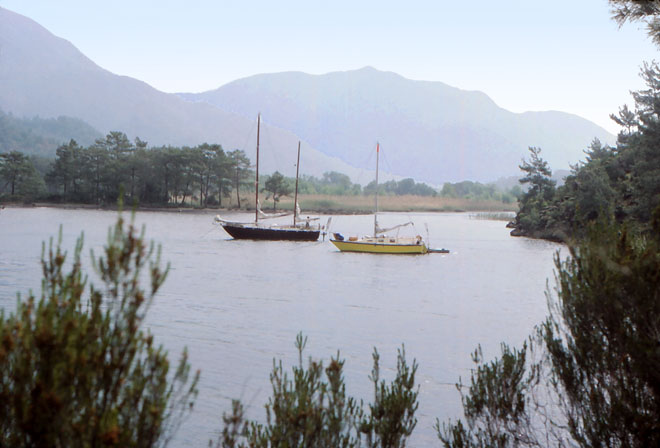 De conserve avec Kalim, Chercha-Païs reprend la partition jouée en compagnie de Nayla et de Super, lors de ses débuts, aux Canaries : après une journée à tirer des bords dans de petits airs, le vent tombe, on démarre le moteur et le gros bateau prend le petit en remorque jusqu’au mouillage, en l’occurrence notre première escale sauvage de Turquie, dans la baie de Karagatch. Cette rade dissimulée entre de hautes montagnes offre une multitude de criques ombragées de pinèdes. Personne ne s’est installé là et une promenade à terre confirme qu’aucun chemin ne dessert cet endroit privilégié, préfiguration de ce que nous verrons sur ce littoral où se succèdent des abris parfaits dépourvus de toute trace humaine. Après un repas en commun sur Kalim, dans cet abri si fermé qu’on dirait un grand lac de montagne, la nuit se fait paradisiaque avec le mariage du calme absolu, de la pleine lune qui fait miroiter la baie entre les îlots, des pins sur les crêtes, du chant des grenouilles et du plouf des dauphins autour de nos bateaux.