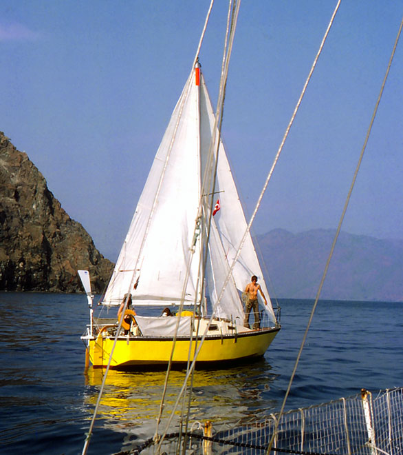 Porte d’entrée maritime de la Turquie, Marmaris nous met également sous les yeux une façon de naviguer encore jamais vue, sous la forme d’une flottille de petits bateaux de location. En effet, il est maintenant possible de faire du voilier derrière un chef qui a une voile rouge et qui dicte les manœuvres à la radio (« Eh, le N° 12, bordez un peu le focfoc : voile d'avant triangulaire., vous traînez ! »), pour s’en aller mouiller de conserve dans les criques désertes. Par bonheur, le périple à venir nous tiendra à l’écart de tels voisins. En revanche, aussitôt après avoir fait la connaissance de l’équipage de Kalim, qui occupe le quai derrière Chercha-Païs, nous allons constituer notre propre flottille en compagnie de ce sympathique petit voilier jaune. Kalim, qui va être de toutes nos aventures turques, est mené par Marc, un garçon d’à peu près vingt ans, très mûr et fort drôle, ex-épicier, architecte naval-constructeur-navigateur, ce qui est peu banal à cet âge. Marc, qui se trouve être un ami de Fixin et de Makali, nos voisins de Caen, a deux équipiers en ce moment, Chantal, une amie, et Daniel, la trentaine, maçon occasionnel fou de voile, le visage have et la barbe hirsute, toujours coiffé d’un béret basque et vêtu d’une veste de costume grise.