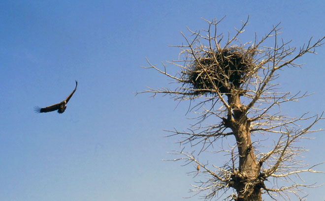 L’après-midi, avec Yamar comme passager pour quelques minutes, un départ à la voile en grand style fait oublier la honte de notre arrivée et nous enchaînons les méandres pour passer la nuit quelques milles plus bas, après le coude de Velor. Au matin, plein soleil quand nous filons avec le jusant jusqu’à l’endroit repéré à la montée, où un couple de vautours niche au sommet d’un arbre isolé.