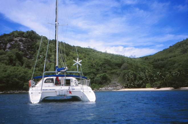 Le lendemain, nous montons tous trois au jardin botanique, qui se révèle très couleur locale avec des blocs de granit sculptés par l’érosion et une végétation luxuriante. Les roussettes patrouillent, les tortues géantes se traînent et, faute d’orchidées, nous apprécions les floraisons de l’arbre "boulet-de-canon", les lianes, les nénuphars, les lataniers et les palmiers de toutes sortes, en particulier le palmier de mer qui donne les fameuses coco-fesses. Yann lie des connaissances à terre dont, en boîte de nuit, des ouvrières philippines de l’énorme conserverie de thons, une des plus importantes au monde, paraît-il, qui voisine le port. Du cockpit, on se régale du ballet aérien des échassiers, dont des cigognes qui ont leur fief sur l’île Hodoul, du nom d’un pirate français qui y était basé.
